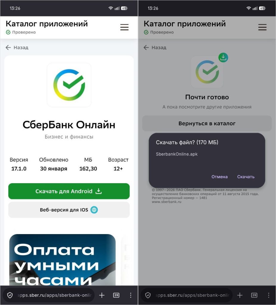 В некоторых случаях обновить приложение на Андроиде можно прямо с сайта разработчика. Там он появляется быстрее, чем в RuStore и Google Play, которые еще и модерируют приложения. Вот как обновить Сбербанк на Андроиде.