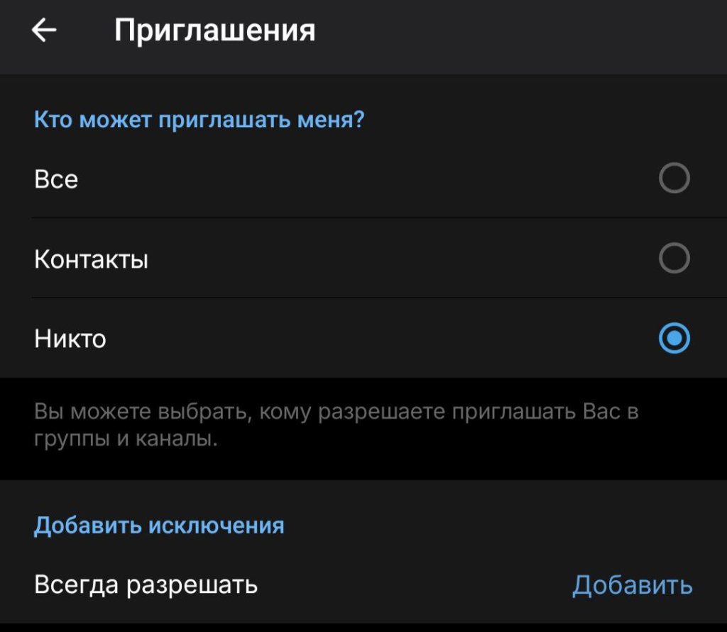 Что это дает? Теперь никто не сможет пригласить вас в группы или каналы, поэтому список ваших подписок не засорится. Включите настройку у себя и своих близких, чтобы защитить от спама.
